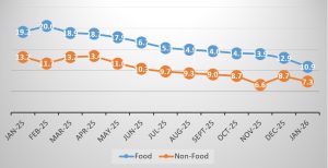 Latest News Annual Food and Non-Food Inflation Annual food inflation for January 2026 was recorded at 10.9 percent compared to 12.9 percent in December 2025 (see Figure below). This means on average prices of food items increased by 10.9 percent