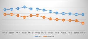 Latest News Annual Food and Non-Food Inflation Annual food inflation for November 2025 was recorded at 13.9 percent compared to 14.1 percent in October 2025 (see Figure 2). This means on average prices of food items increased by 13.9 percent