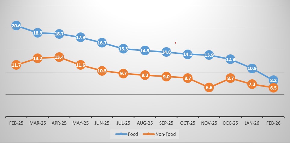 Latest News Annual Food and Non-Food Inflation Annual food inflation for February 2026 was recorded at 8.2 percent compared to 10.9 percent in January 2026. This means on average prices of food items increased by 8.2 percent between February 2025 and February 2026. This was mainly attributed to price movements in prices of food items […]