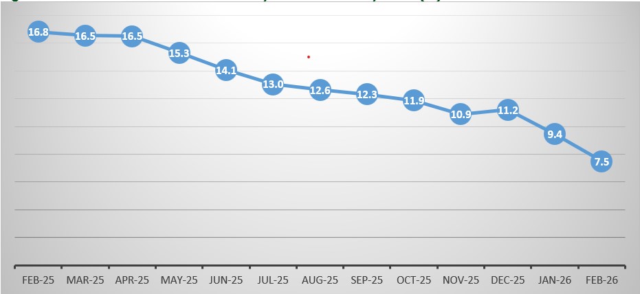 Latest News Year-on-Year Inflation Rate for February 2026 at 7.5 Percent Annual inflation for February 2026 was recorded at 7.5 percent from 9.4 percent recorded in January, 2026.This means that on average, prices of goods and services increased by 7.5 percent between February 2025 and February 2026. This development was attributed to price movements in […]